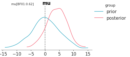 >>> plot_bf(dt, var_names="mu", kind="hist")