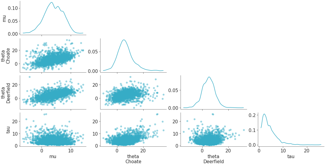 marginal=Falseandtriangleset to “upper”. In this case, sincemarginal=False, soxlabelandylabelare disabled by default, and diagonal plots contain variable names as labels.xticksandyticksare also set on diagonal plots along withticklabels, to map ticks to rows and columns. Sincemarginal=False, sosharexis set to “col” andshareyis set to “row” by default.>>> plot_pair( >>> dt, >>> coords = {"school":"Choate"}, >>> visuals={"divergence": True}, >>> marginal=False, >>> triangle="upper", >>> )